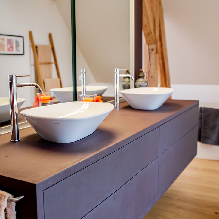 Ein Traum wird wahr: Das moderne Badezimmer mit den heimeligen Balken entstand im Dachstock der über 100-jährigen Villa Fronheim. Eine private Wellnessoase, welche keine Wünsche offen lässt.